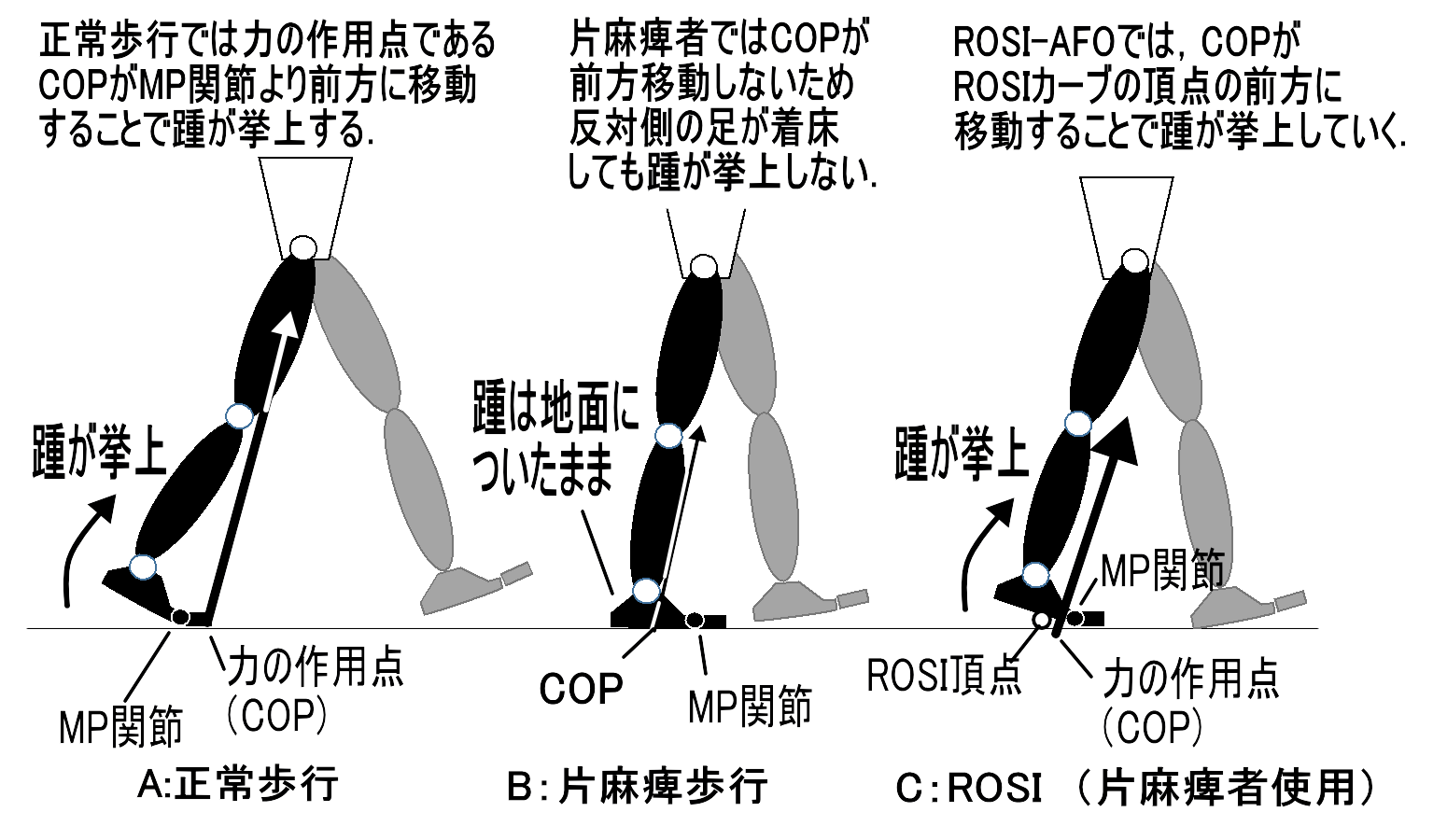 | ROSIはこれまでの装具で達成できなかったフォアフットロッカーを補助します.フォアフットロッカーは片脚で体重を支持しているときに,踵を挙げる必要があります.正常歩行では,力の作用点であるCOPが足の付け根(MP関節)よりも前方に移動することで踵が挙上しますが,脳卒中片麻痺者では,COPの前方移動がうまくできません.ROSIを今,お使いの装具の下に追加すると,ROSI頂点が仮想の回転軸となり,踵が挙げやすくなります.その結果,足のつまづきを予防します. |